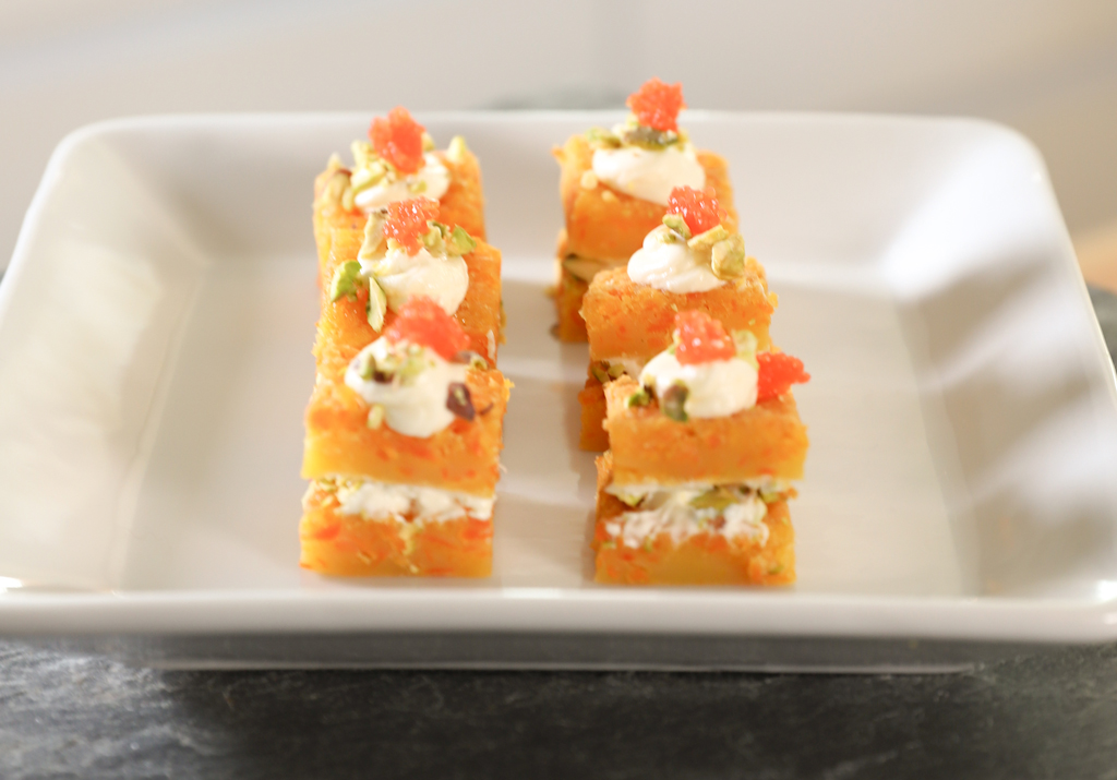 Mini carrot cakes con crema de limón y jengibre, profiteroles con crema de queso azul, mini scons con queso Philadelphia y salmón ahumado, tarteletas con crema de palta, cebolla frIta y mango, hojaldraditos de atún con alcaparras y morrón asado.