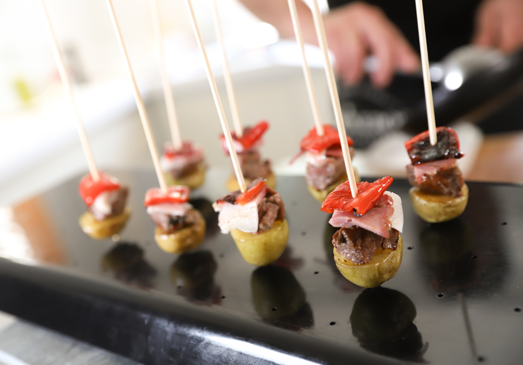 PINCHOS DE LOMO, PANCETA, MORRÓN Y PAPINES ANDINOS